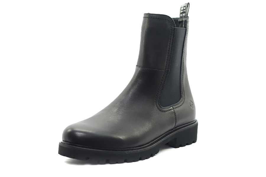 Dámská zimní obuv Axel v černé barvě, šíře H, kombinuje kůži s elastickým materiálem, zateplenou podšívku a vyjímatelnou stélku, ideální pro pohodlí při halluxech a kladívkových prstech.