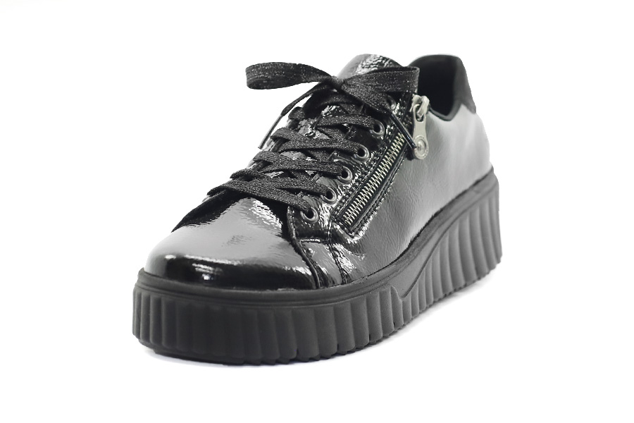 Černá vycházková teniska Rieker šíře G s lakovaným koženým svrškem, pohodlnou vyjímatelnou stélkou a výraznou podešví pro stylový vzhled a komfortní nošení.