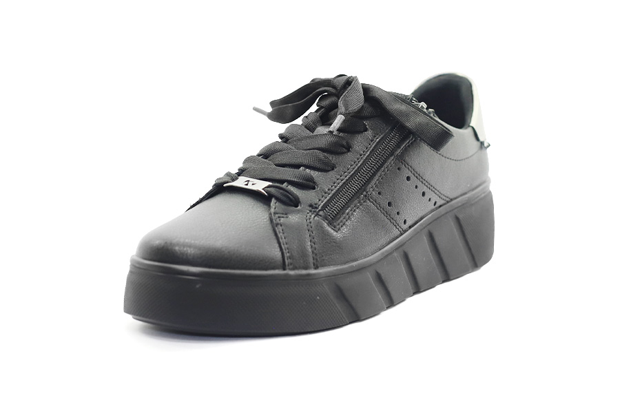 Černé metalické tenisky Remonte, šíře G, s nepromokavou membránou Remonte TEX, měkkou vyjímatelnou stélkou a bočním zipem pro snadné obouvání.