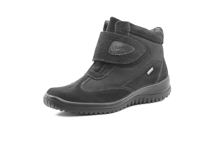 Černá dámská vycházková obuv z velurové kůže s filcovým zateplením, zapínáním na suchý zip a pohodlným širším střihem pro komfortní nošení v chladných dnech.