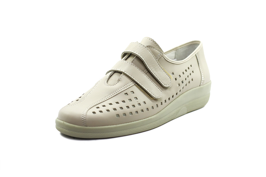 Béžové kožené vycházkové polobotky v šíři G se zapínáním na suchý zip, vyjímatelnou koženou stélkou a klínkem 3 cm pro pohodlné každodenní nošení.