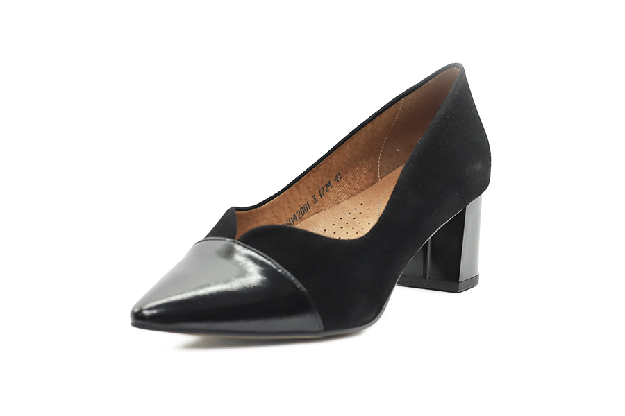 Dámské lodičky Pulso v černém provedení kombinují velur a lakovanou kůži, mají šíři G, koženou podšívku a pohodlný stabilní podpatek 5,5 cm s jemnou platformou 0,5 cm pro elegantní a