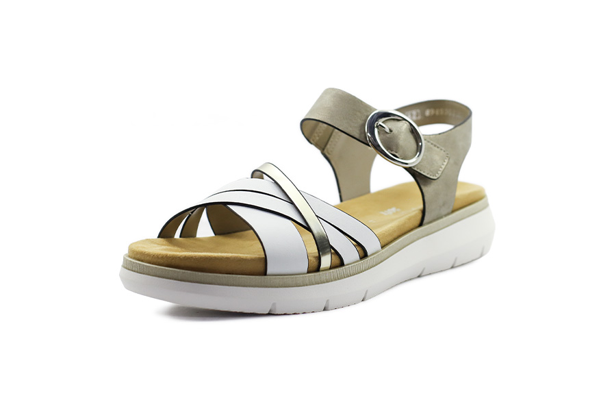 Dámské sandály v bílo zlaté kombinaci v šíři G, se zapínáním na suchý zip, vyjímatelnou tvarovanou stélku a stabilním téměř 4cm klínkem pro pohodlné každodenní nošení.