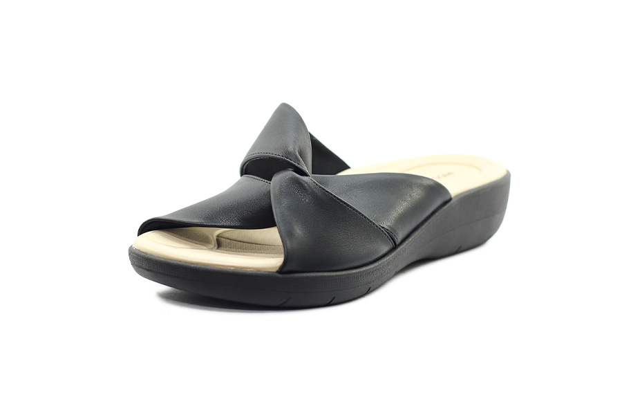 Černé pantofle Piccadilly na 5cm klínku s lehkou flexibilní podešví a měkkými překříženými pásky pro pohodlné letní nošení.