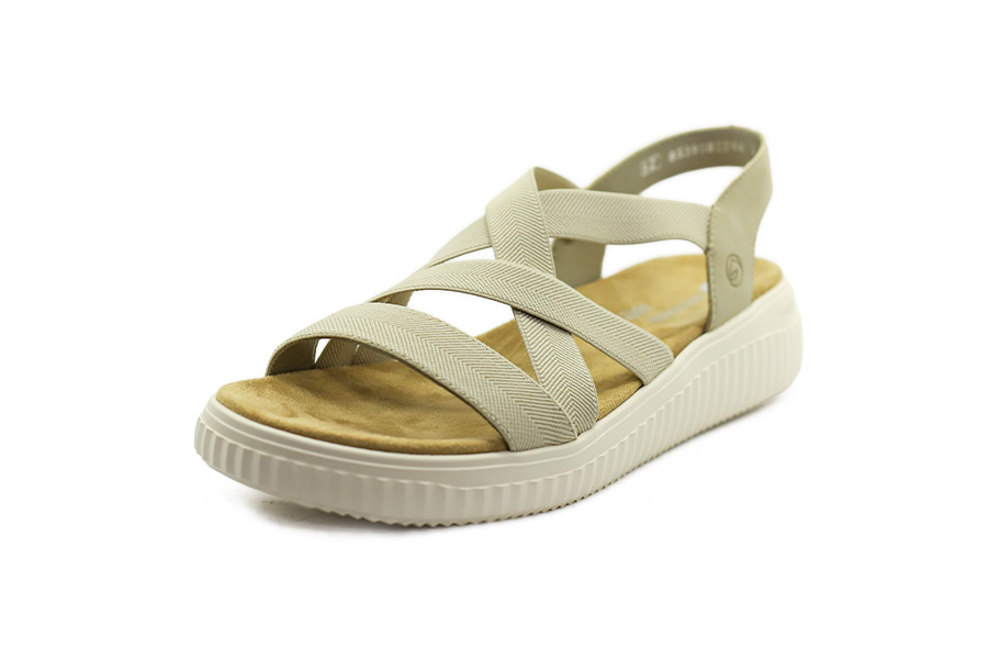 Béžové dámské sandály Remonte v šíři G s pružnými pásky, masivnější podešví Lite'n Soft a pohodlnou textilní stélkou pro každodenní nošení.