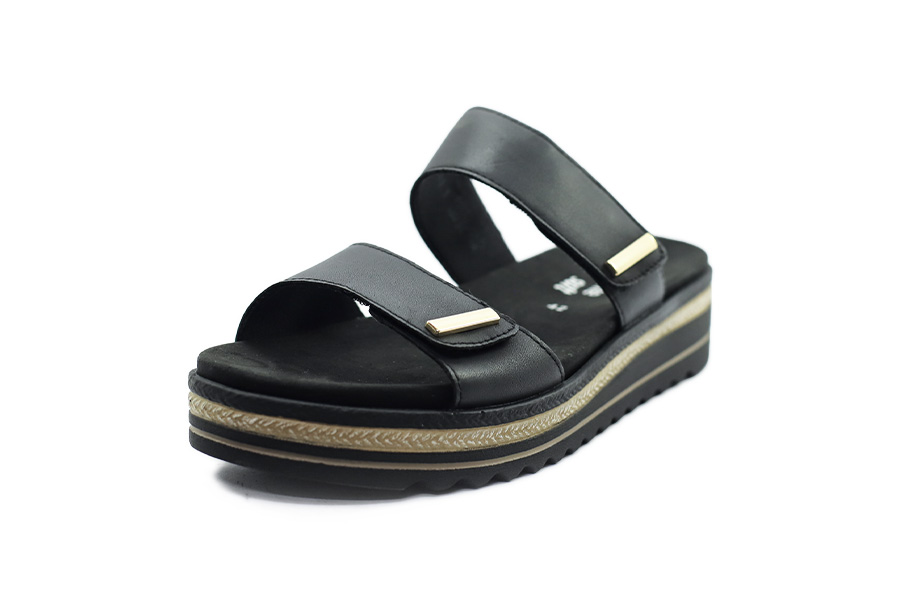 Černé kožené nazouváky v šíři H s nastavitelnými pásky na suchý zip, vyjímatelnou stélkou a lehkou platformou Lite'n Soft pro maximální letní pohodlí