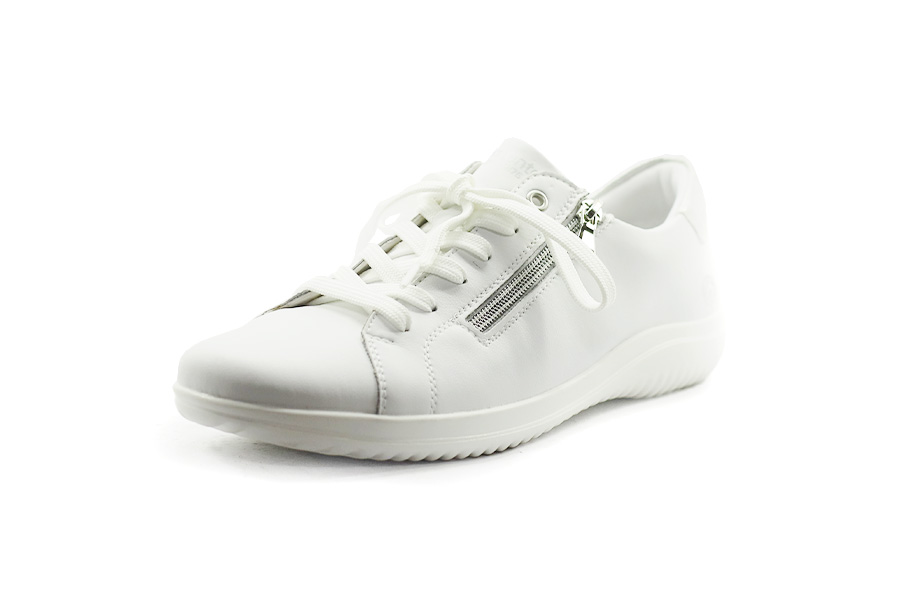 Dámské tenisky Remonte v bílé barvě, šíře G, s hladkým koženým svrškem, šněrováním a bočním zipem pro snadné obouvání. Vyjímatelná stélka Remonte Soft a lehká podešev Lite'n Soft zajišťují maximální
