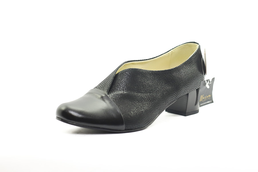 Dámské polobotky Mistic v černé barvě, šíře G až H, kombinují hladkou kůži a strečový materiál pro pohodlí širších chodidel i halluxů, s páskem na suchý zip a 4cm podpatkem