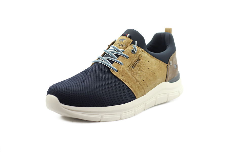Pánská volnočasová obuv Mustang v tmavě modrohnědé kombinaci nabízí pohodlný střih v šíři G, vyjímatelnou měkčenou textilní stélku a pružné šněrování, díky kterému se obouvá rychle a jednoduše bez zavazování.