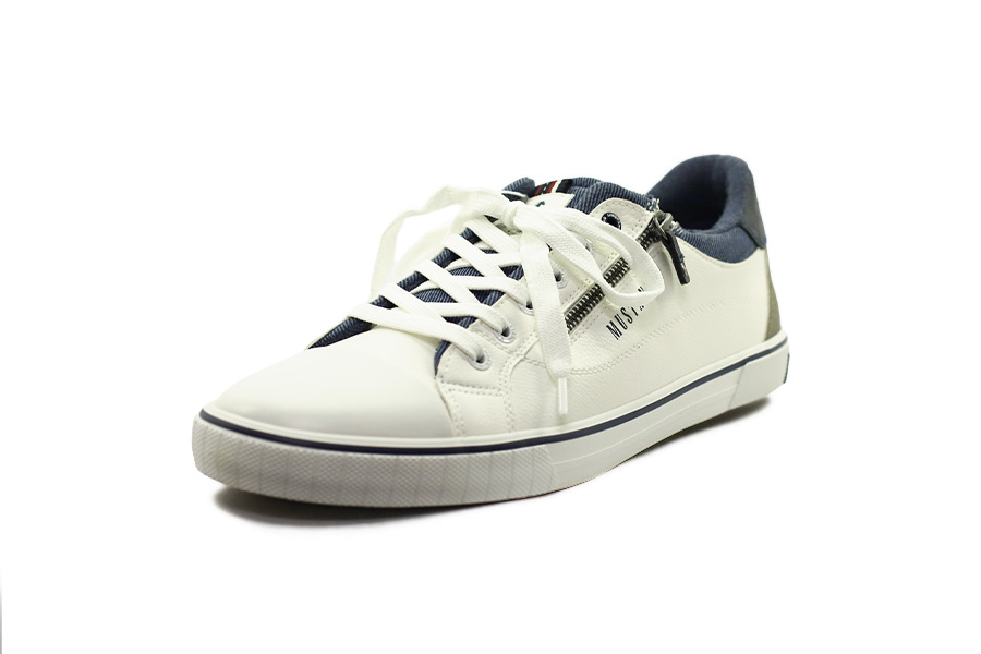 Bílé pánské tenisky Mustang v šíři G mají svršek ze syntetiky a textilie, měkkou vypolstrovanou stélku, froté podšívku a praktický boční zip pro rychlé obouvání.