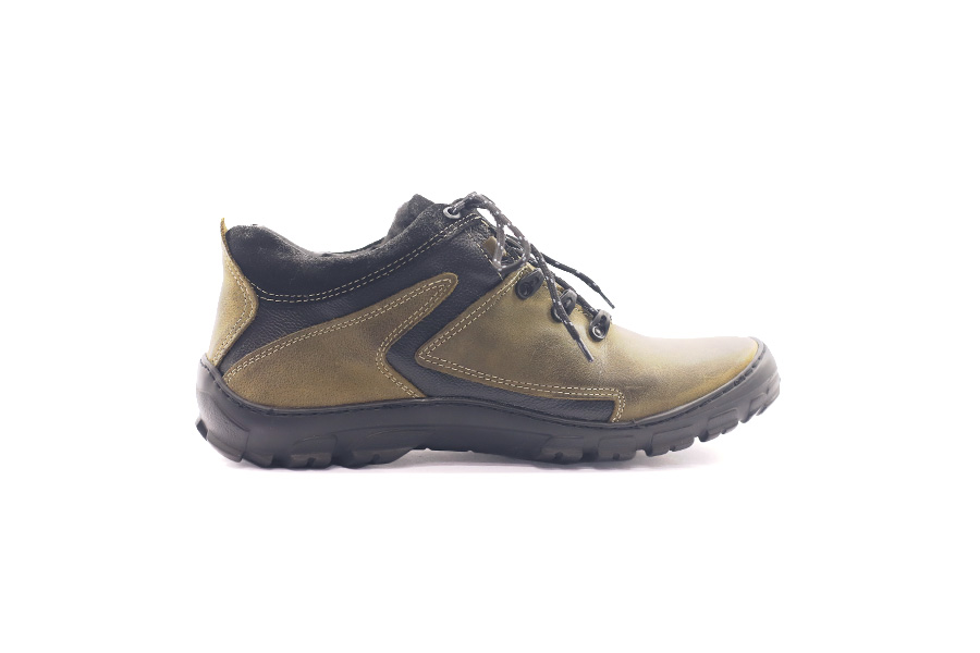 Pánská zimní kotníková obuv De-Plus v kombinaci olivové a černé barvy, šíře G, je vyrobena z hladké a maštěné kůže, doplněná textilní podšívkou s lehkým zateplením. Zateplená nevyjímatelná stélka a syntetická podešev s hrubým vzorkem poskytují pohodlí a bezpečný krok při každodenním nošení.