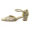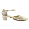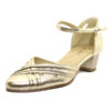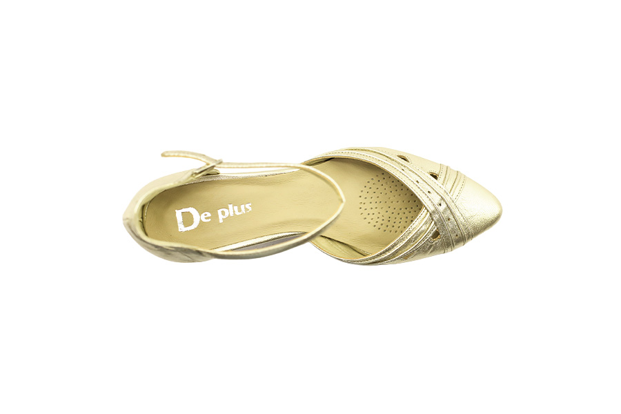 Dámské lodičky De-Plus ve zlaté barvě, šíře G, vyrobené z metalické kůže, spojují eleganci a pohodlí. Měkčená kožená stélka poskytuje komfort při nošení, zatímco 4 cm vysoký a stabilní podpatek zajišťuje pohodlný krok. Nastavitelný pásek kolem kotníku umožňuje lepší fixaci chodidla, což činí tuto obuv ideální volbou pro společenské i formální události.
