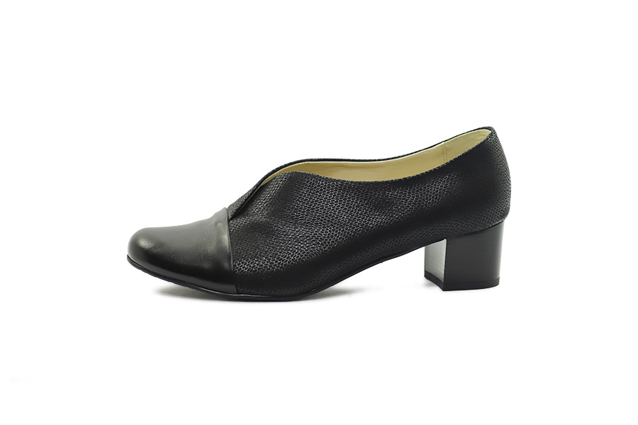 Dámské černé lodičky s jemným hadím vzorem, vyrobené z kvalitní kůže, zaujmou elegantní kombinací strukturovaného svršku a hladké kožené špice, která dodává modelu sofistikovaný vzhled. Kožená stélka zajišťuje příjemný komfort při chůzi a stabilní podpatek o výšce 4 cm poskytuje jistotu i při delším nošení. Tento nadčasový model je ideální jako vycházková obuv a skvěle se hodí také ke společenským příležitostem.