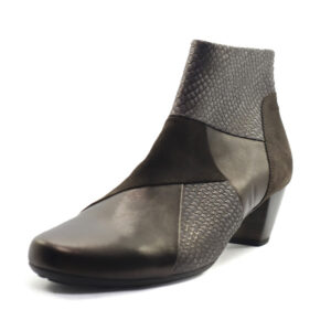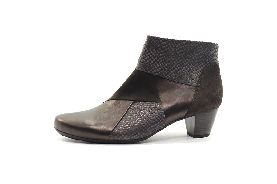 Elegantní kotníková obuv v hnědém odstínu s efektním hadím vzorem zaujme kombinací hladké kůže a veluru, která dodává modelu zajímavý a moderní vzhled. Harmonické spojení různých struktur vytváří stylový design, jenž snadno oživí podzimní i jarní outfity.