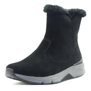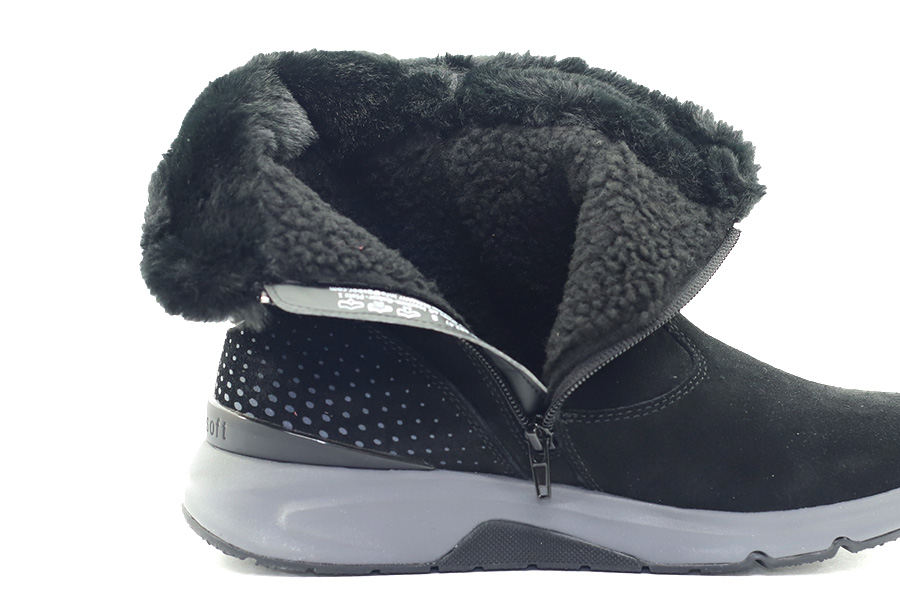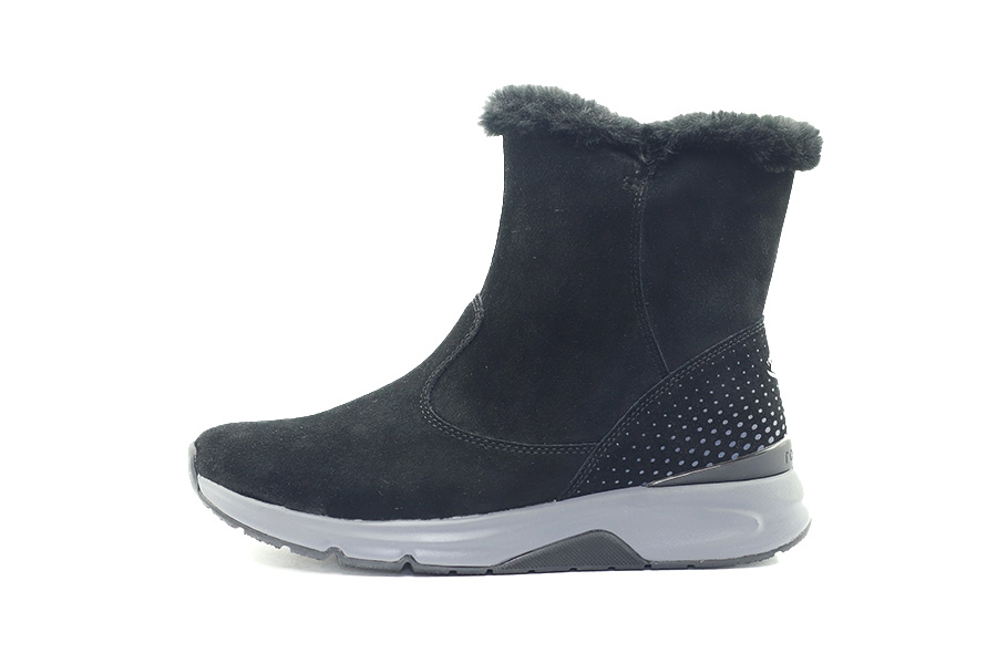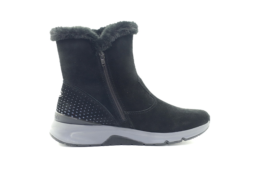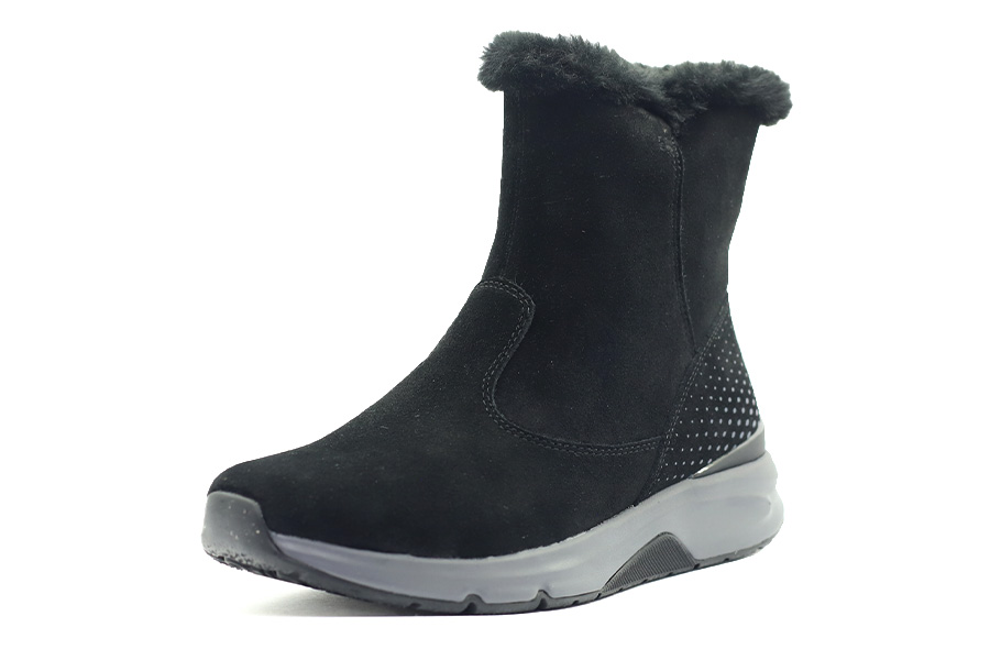 Stylová dámská kotníková obuv Gabor Rolling Soft v černé barvě je skvělou volbou do chladného počasí. Svršek z broušené kůže doplňuje hebká kožešinka na horním lemu, která dodává modelu hřejivý vzhled i dojem. Uvnitř se nachází velmi teplá podšívka z umělého beránku a měkčená vyjímatelná stélka, také potažená beránkem, která poskytuje maximální pohodlí a tepelný komfort. Zip na vnitřní straně usnadňuje nazouvání, zatímco technologie rollingsoft® podporuje přirozený pohyb chodidla a pružnost při každém kroku. Díky výšce svršku cca 15,5 cm, kulaté špičce a moderní podešvi je tato obuv ideální volbou pro pohodlné nošení po celý zimní den.