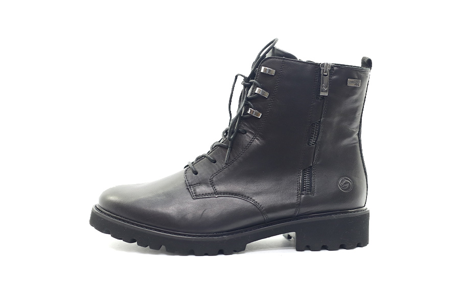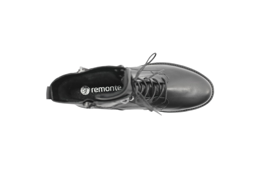Dámská kotníková obuv Remonte v černém provedení z kvalitní hladké kůže zaujme nadčasovým vzhledem i praktickým zpracováním. Model je vybaven technologií Remonte TEX, která zajišťuje nepromokavost při zachování prodyšnosti, takže se na něj můžete spolehnout i v nepříznivém počasí. Funkční šněrování umožňuje ideální přizpůsobení tvaru nohy a vnitřní zip usnadní rychlé obouvání.