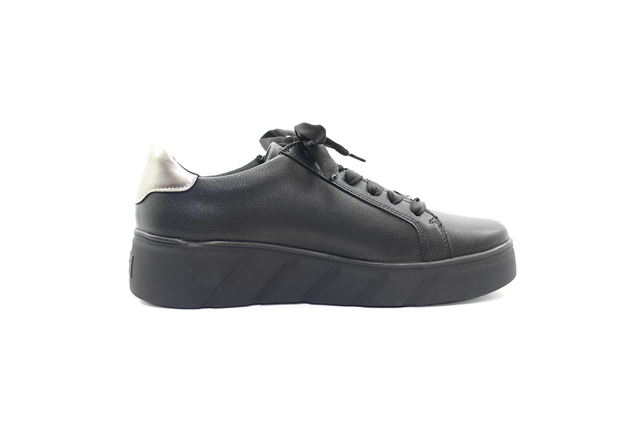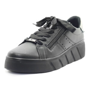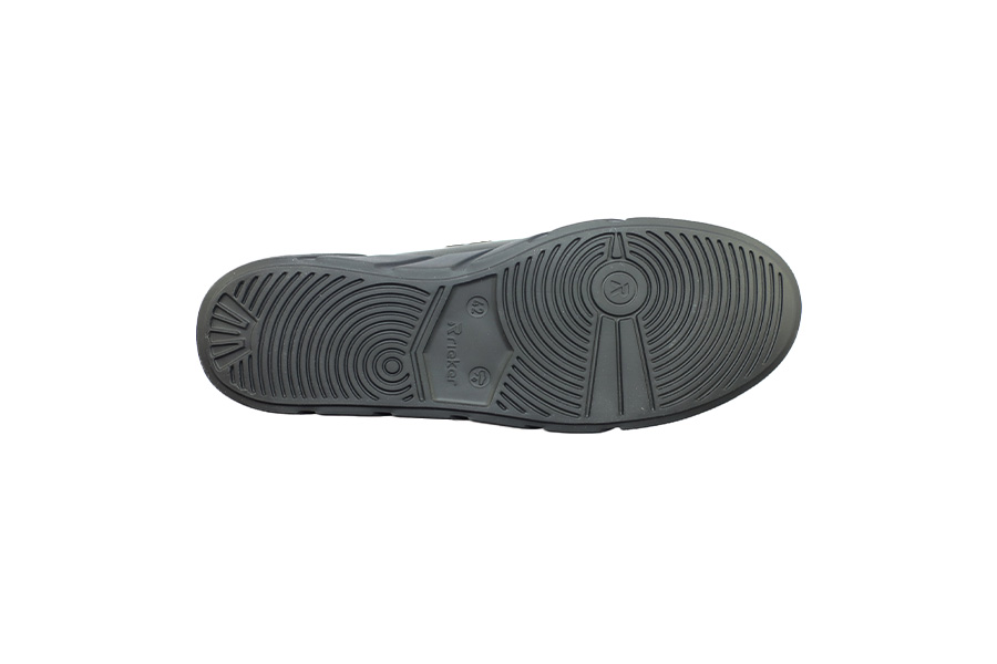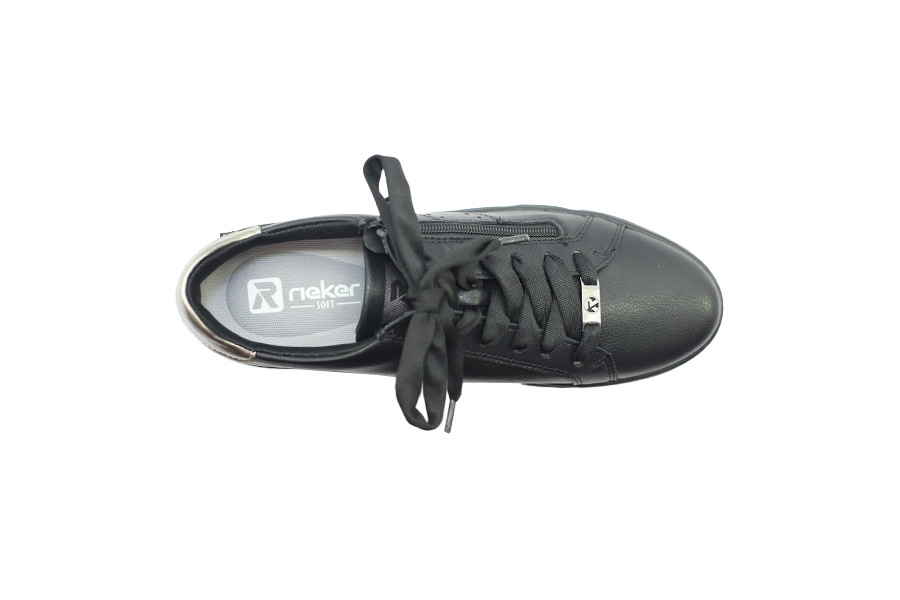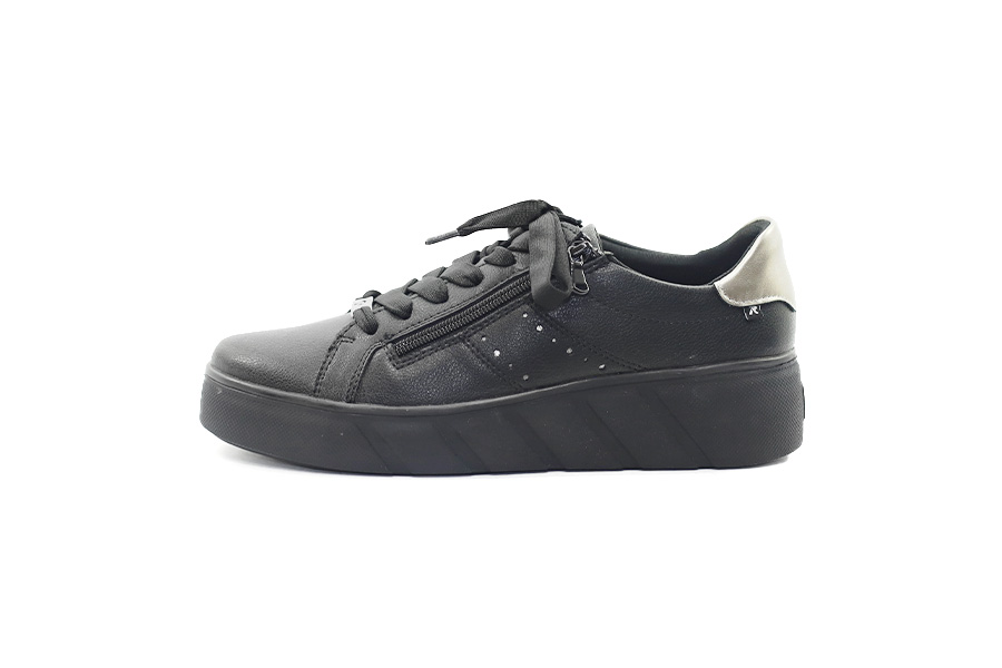 Černá vycházková teniska Rieker, šíře G, s vyjímatelnou měkkou stélkou Rieker Soft, bočním zipem a vyšší podešví pro pohodlné nošení i při celodenním pohybu.